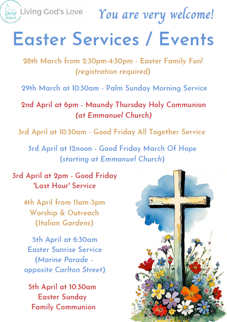 The next Evening Service will take place on Sunday 29th March at 6pm. There will be a number of prayer stations illustrated by pictures with some suggestions for meditation or prayer on a card. You will also be able to access the church to make use of these prayer stations on Monday 30th and Tuesday 31st March between 9:30am-12:30pm.